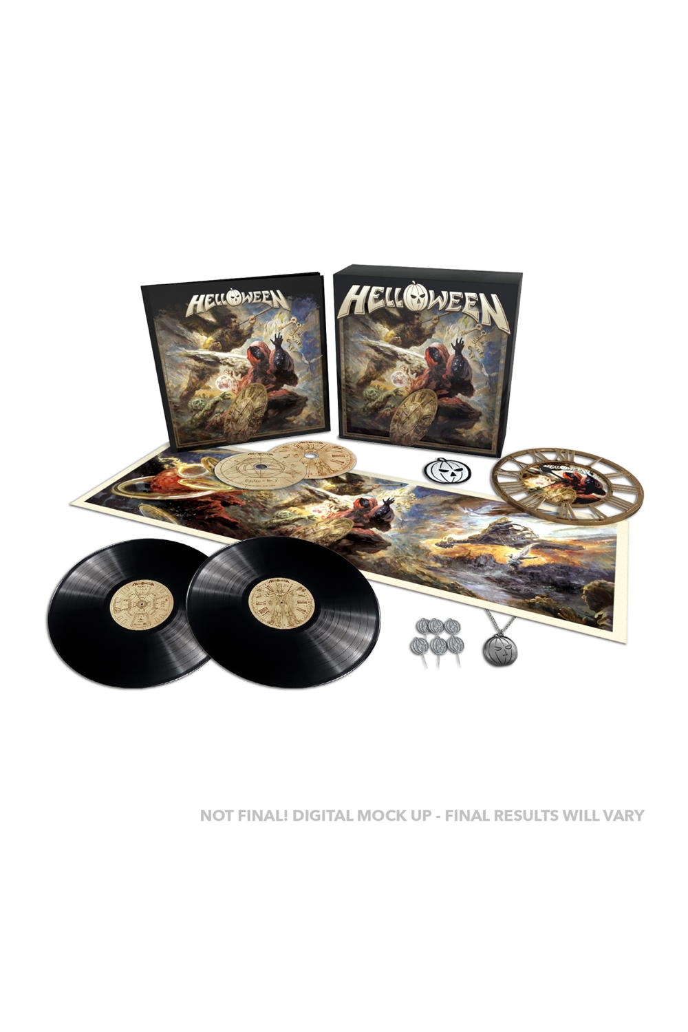 Limited box set incl. earbook with “Helloween” album on CD, 3 track bonus CD and black double vinyl incl. two bonus tracks. Plus HELLOWEEN clock, album cover print, six pins, necklace, patch and certificate.